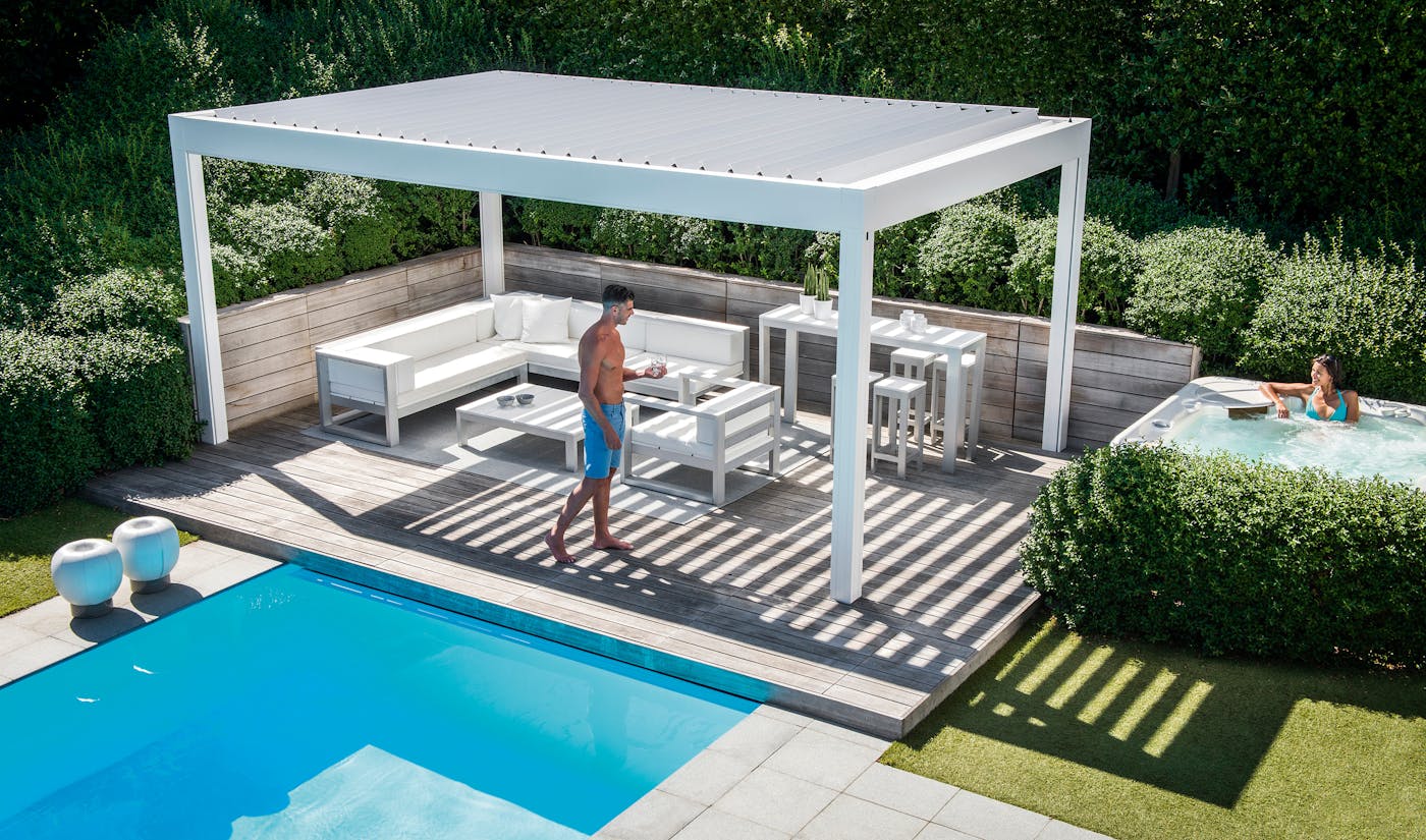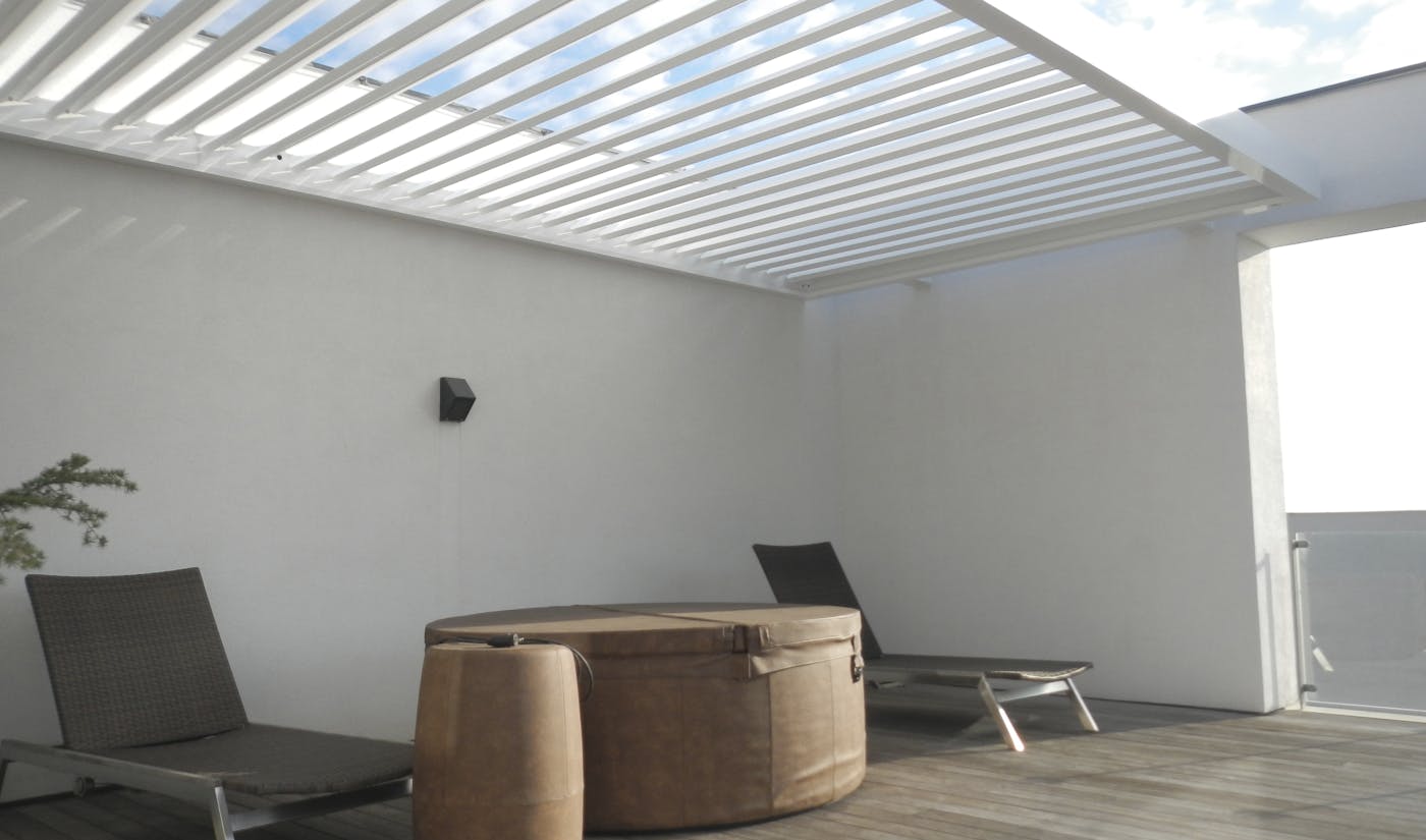 Elegante terrasoverkapping uit aluminium met roteerbaar lamellendak
