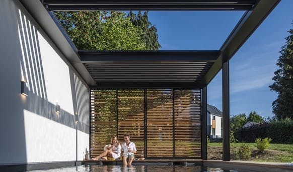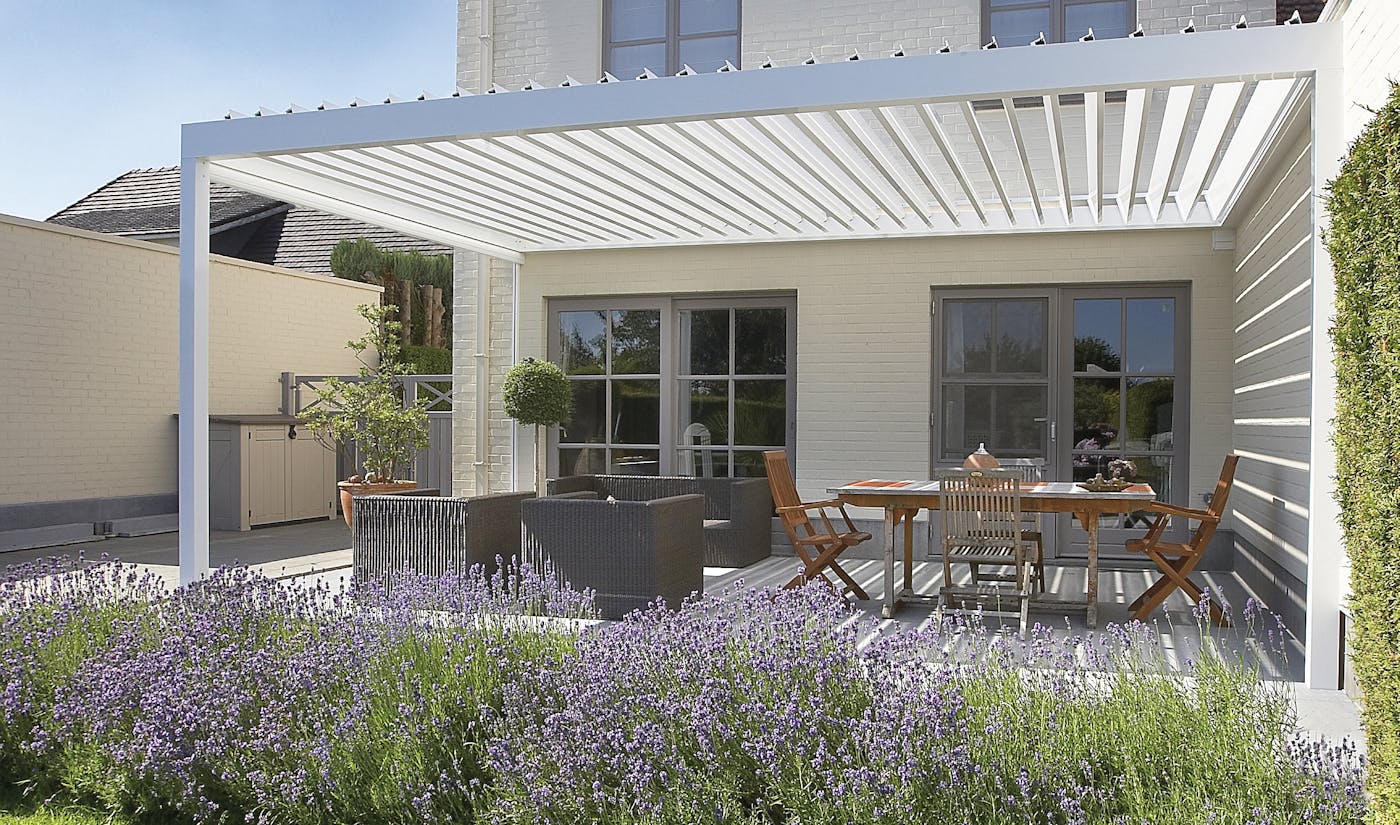 Roteerbare lamellen in een slanke overkapping voor je terras