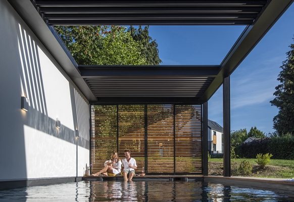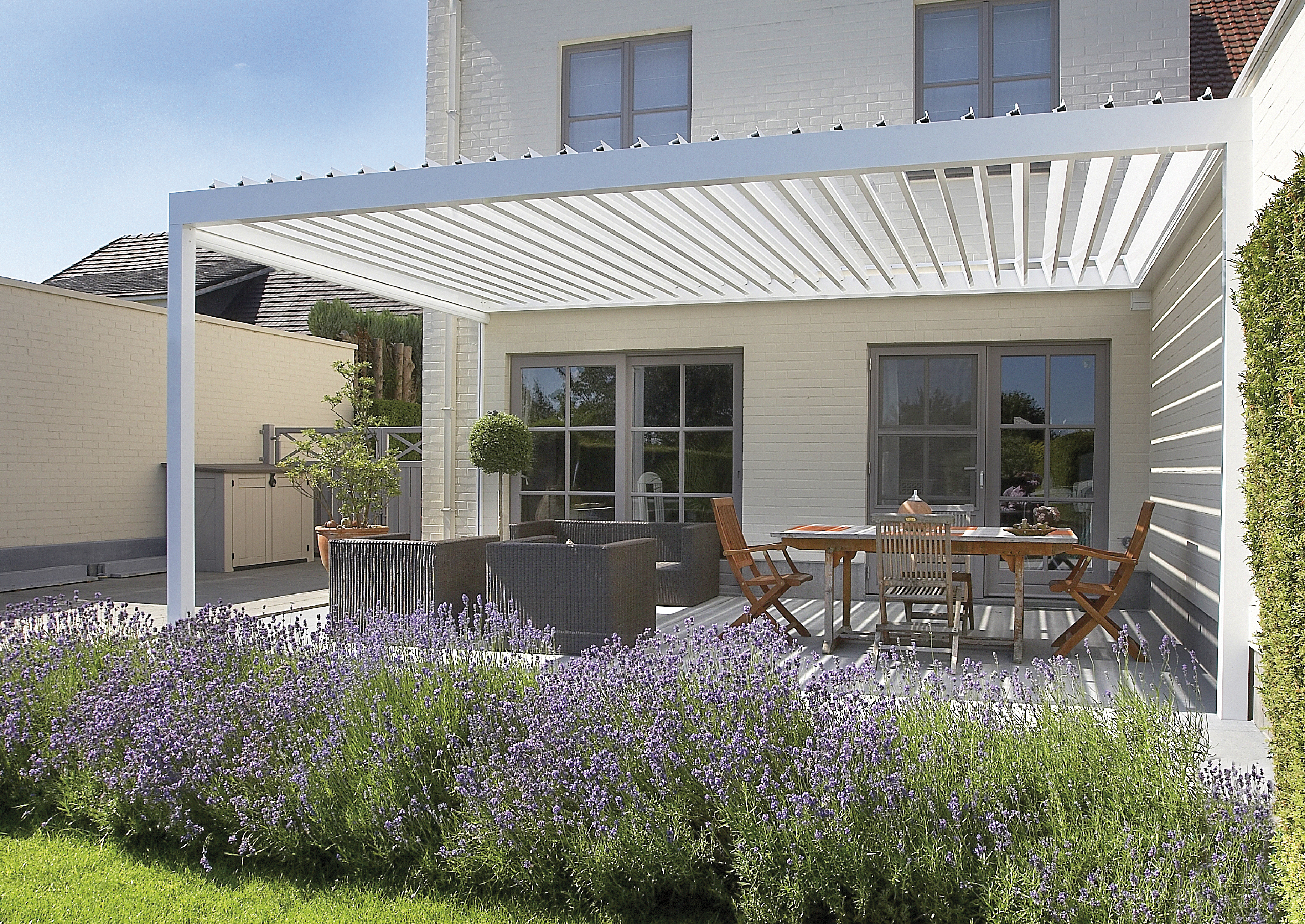Roteerbare lamellen in een slanke overkapping voor je terras